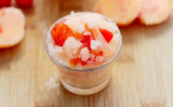Hẳn là nhiều người trong chúng ta chẳng còn xa lạ gì với món cà chua trộn đường tuổi thơ. Thế nhưng bạn có biết rằng combo cà chua và đường cũng có thể dùng để tẩy da chết?Cách làm cũng siêu đơn giản. Rắc 1/5 thìa cà phê đường lên quả cà chua đã cắt nhỏ. Từ từ massage da mặt với cà chua theo chuyển động tròn. Lưu ý là chúng ta không nên chà xát quá mạnh để tránh gây kích ứng da. Sau đó, rửa sạch mặt bằng nước ấm.
