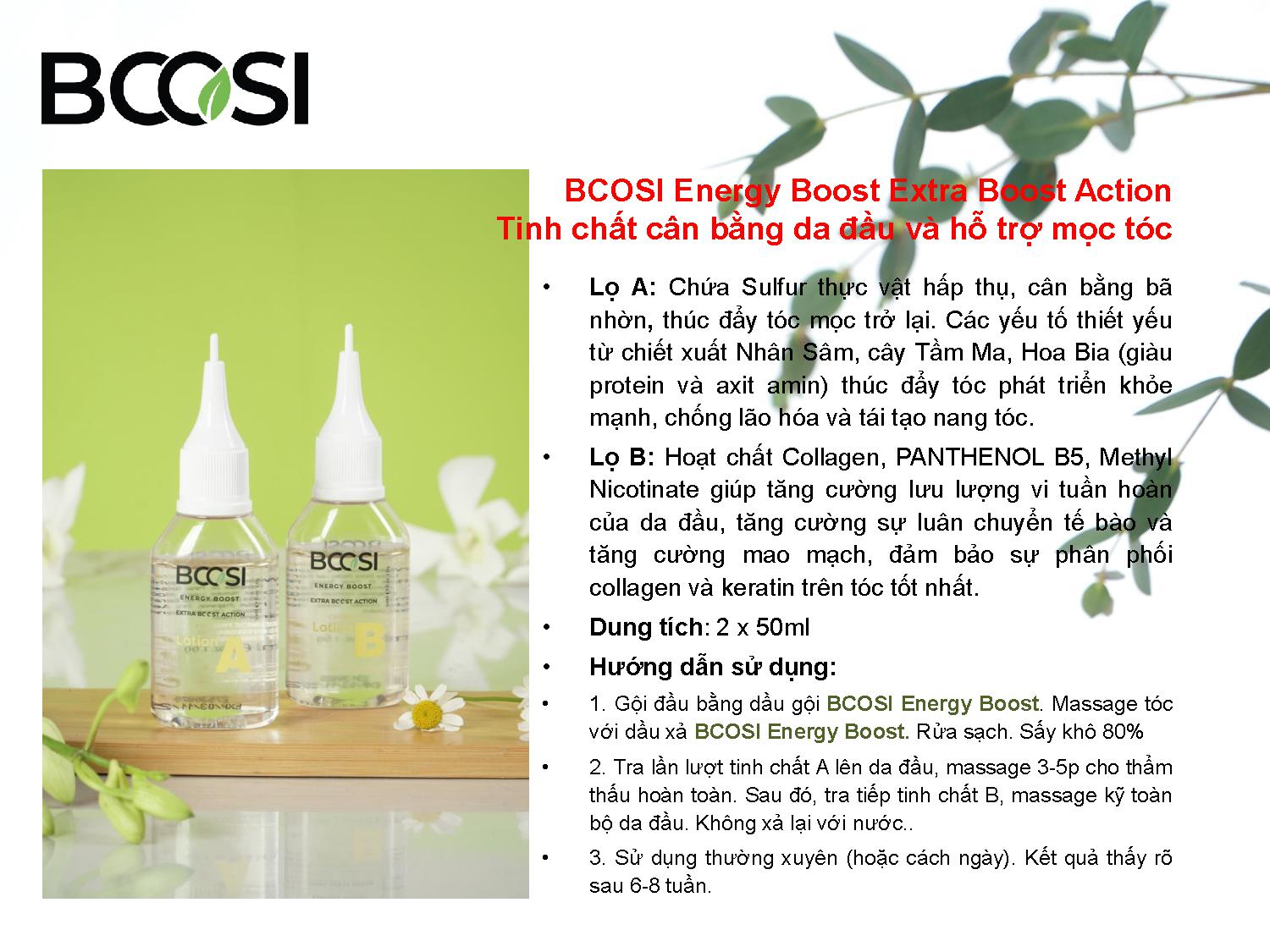 Với công thức dưỡng tóc được chắt lọc từ tinh túy thiên nhiên như hoa bia, bạc hà, cây tầm ma, nhân sâm, kết hợp công nghệ độc quyền, quy trình lên men và phương thức mát-xa bấm huyệt truyền thống. Liệu pháp 3 bước từ Bcosi giúp liên kết nang tóc và chân tóc để giữ tóc chặt hơn, đồng thời bổ sung dưỡng chất để thúc đẩy và kéo dài quá trình phát triển của tóc.