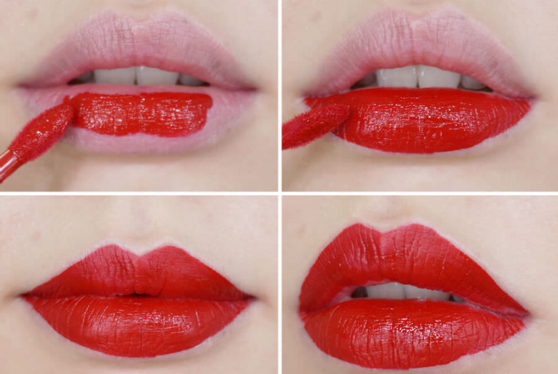 Cách 2: Dùng cọ quết một lớp mỏng son nhẹ nhàng từ lòng môi ra bên ngoài, không nên đánh từ ngoài vào trong màu sẽ không lên tự nhiên. Dùng ngón tay tán đều son để môi không có vết nứt ngay khi đánh son.