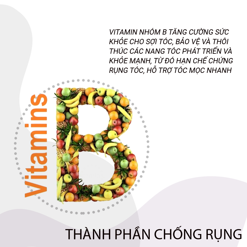 Một thành phần cực kỳ quan trọng đối với vòng đời của sợi tóc là nhóm các vitamin B. Đây là thành phần “thuốc bổ” có chức năng tăng cường sức khỏe cho sợi tóc, bảo vệ và thôi thúc các nang tóc phát triển và khỏe mạnh, từ đó hạn chế chứng rụng tóc, hỗ trợ tóc mọc nhanh. Vitamin B5 kết hợp với Biotin (Vitamin H) là hai nhóm vitamin quan trọng nhất cung cấp dưỡng chất thiết yếu đầy đủ cho tóc mọc nhanh hơn, thân tóc mập và bóng hơn. Bởi vậy nhóm Vitamin này được ứng dụng rộng rãi trong các thuốc đặc trị và sản phẩm chống rụng và hỗ trợ mọc tóc.