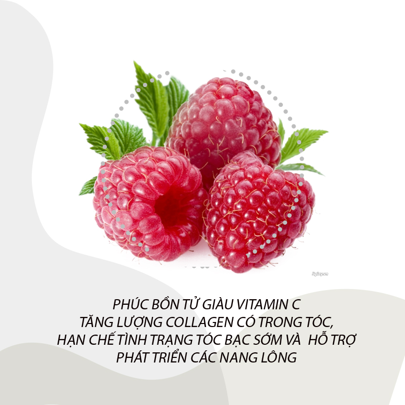 Phúc bồn tử giàu vitamin C và các dưỡng chất quan trọng khác cho sự phát triển của tóc. Vitamin C cũng giúp tăng lượng collagen có trong tóc, ngoài ra chúng giúp tóc bạn hấp thụ dễ dàng các khoáng chất và khiến tóc trông khỏe hơn. Bên cạnh đó, phúc bồn tử còn hạn chế tình trạng tóc bạc sớm và hỗ trợ phát triển các nang lông. Bạn cũng có thể sử dụng nước chiết xuất từ cây phúc bồn tử hoặc bột phúc bồn tử từ những cửa hàng thảo dược.