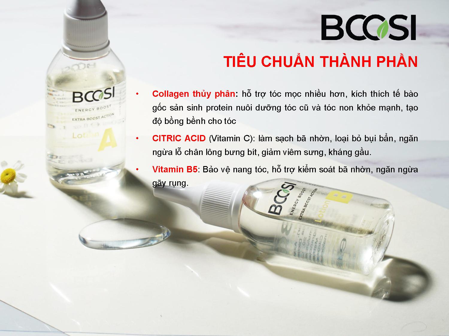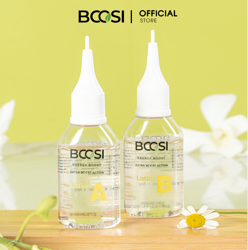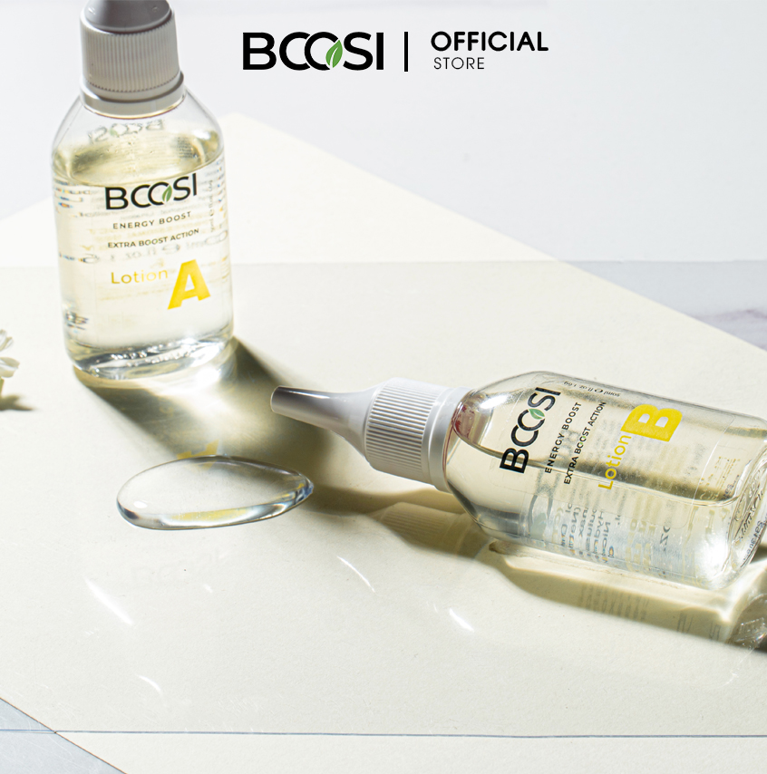 Công dụng: Tinh chất Bcosi Energy Boost Extra Boost Action Các chiết xuất từ Nhân sâm, cây Tầm, tinh chất hoa Bia, Collagen, vitamin C, B5 giúp cân bằng tuyến dầu, nuôi dưỡng nang tóc chắc khỏe trở lại và hỗ trợ tóc mọc nhanh và dày trở lại. Đồng thời bảo vệ tóc và da đầu trước hư tổn do tác nhân môi trường.