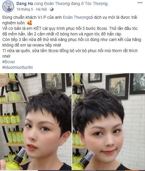 FB Đặng Hà chia sẻ “Về cơ bản là em KẾT cái quy trình phục hồi 5 bước Bcosi. Thử lần đầu tóc đã mềm hẳn, lần 2 cảm nhất rõ bóng hơn và ngọn tóc đỡ hẳn ráp. Còn tiếp 3 lần nữa để thử khả năng phục hồi có đúng như cam kết của hãng không để em lại review tiếp nhá”