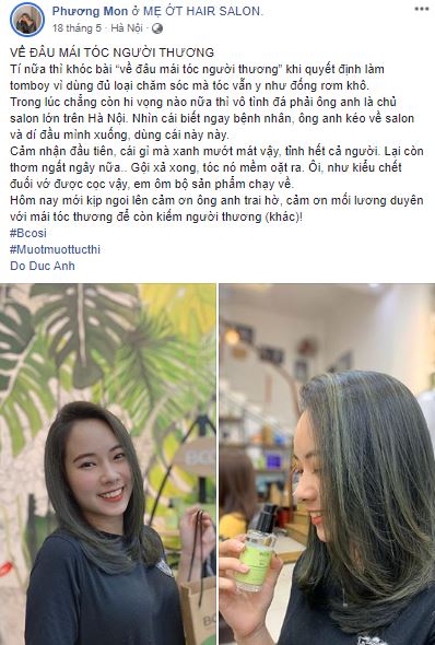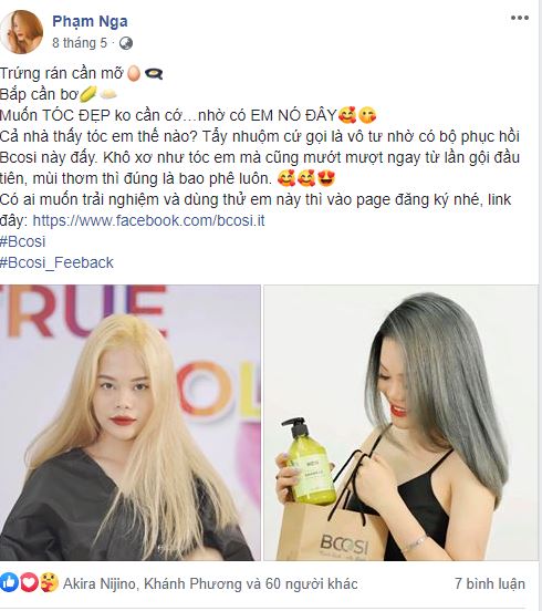 Fb Phạm Nga đánh giá cao khả năng phục hồi của Bcosi với mái tóc thường xuyên tẩy nhuồm “Cả nhà thấy tóc em thế nào? Tẩy nhuộm cứ gọi là vô tư nhờ có bộ phục hồi Bcosi này đấy. Khô xơ như tóc em mà cũng mướt mượt ngay từ lần gội đầu tiên, mùi thơm thì đúng là bao phê luôn”