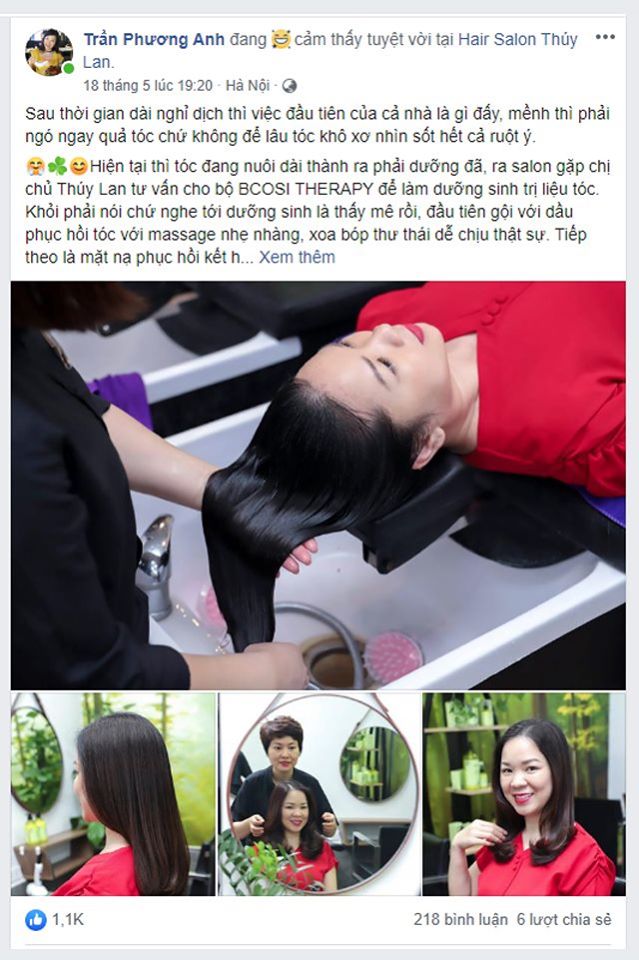 Hotmon Trần Phương Anh chia sẻ “ ...đầu tiên gội với dầu phục hồi tóc với massage nhẹ nhàng, xoa bóp thư thái dễ chịu thật sự. Tiếp theo là mặt nạ phục hồi kết hợp hấp ozon, tóc mềm mượt tuột khỏi tay là có thật cả nhà ạ. Cuối cùng là lớp tinh dầu bảo vệ tia UV và tác nhân gây hại từ môi trường ...Vậy là chỉ mất chưa đầy 1 tiếng, tóc đã được hồi sinh ngay từ lần đầu tiên”