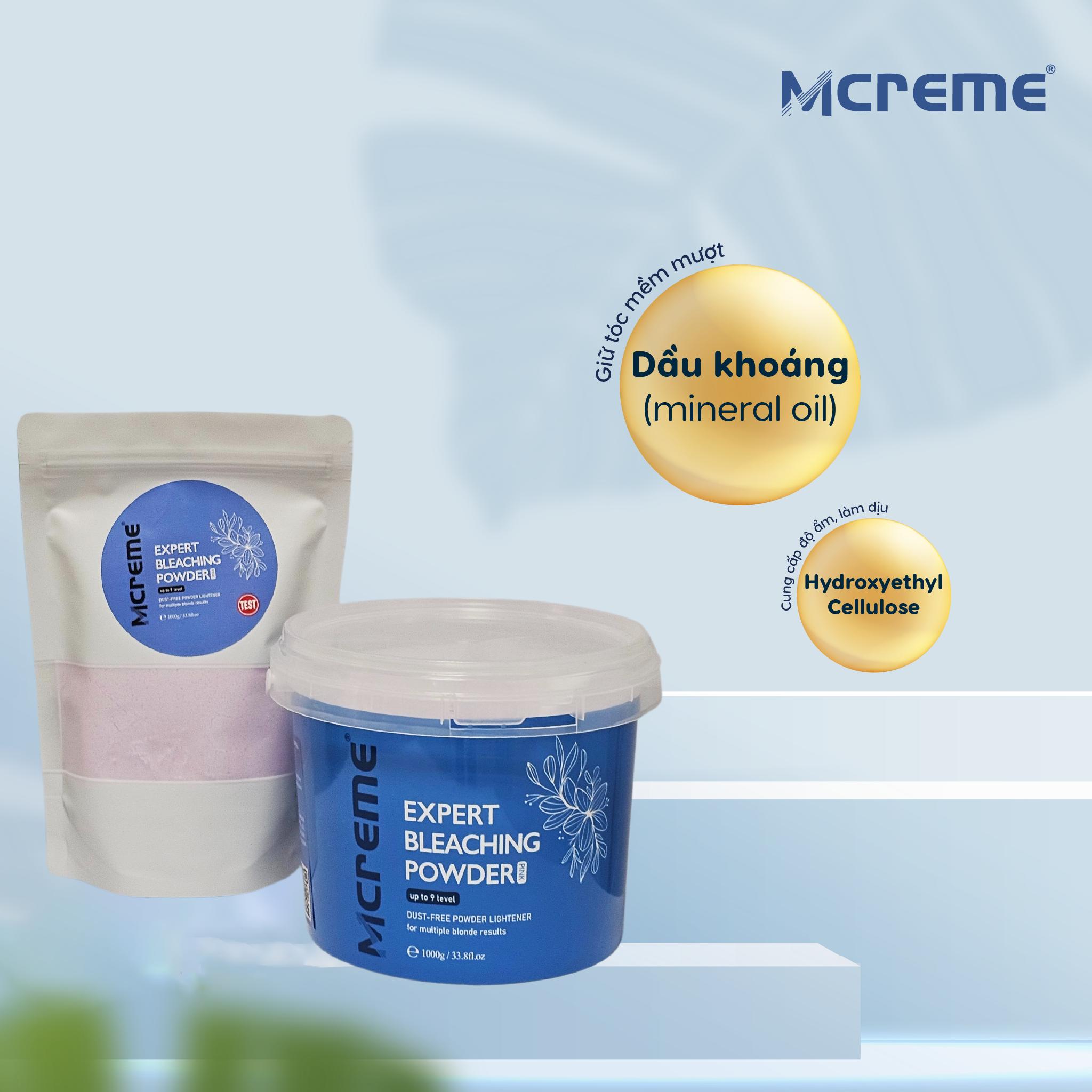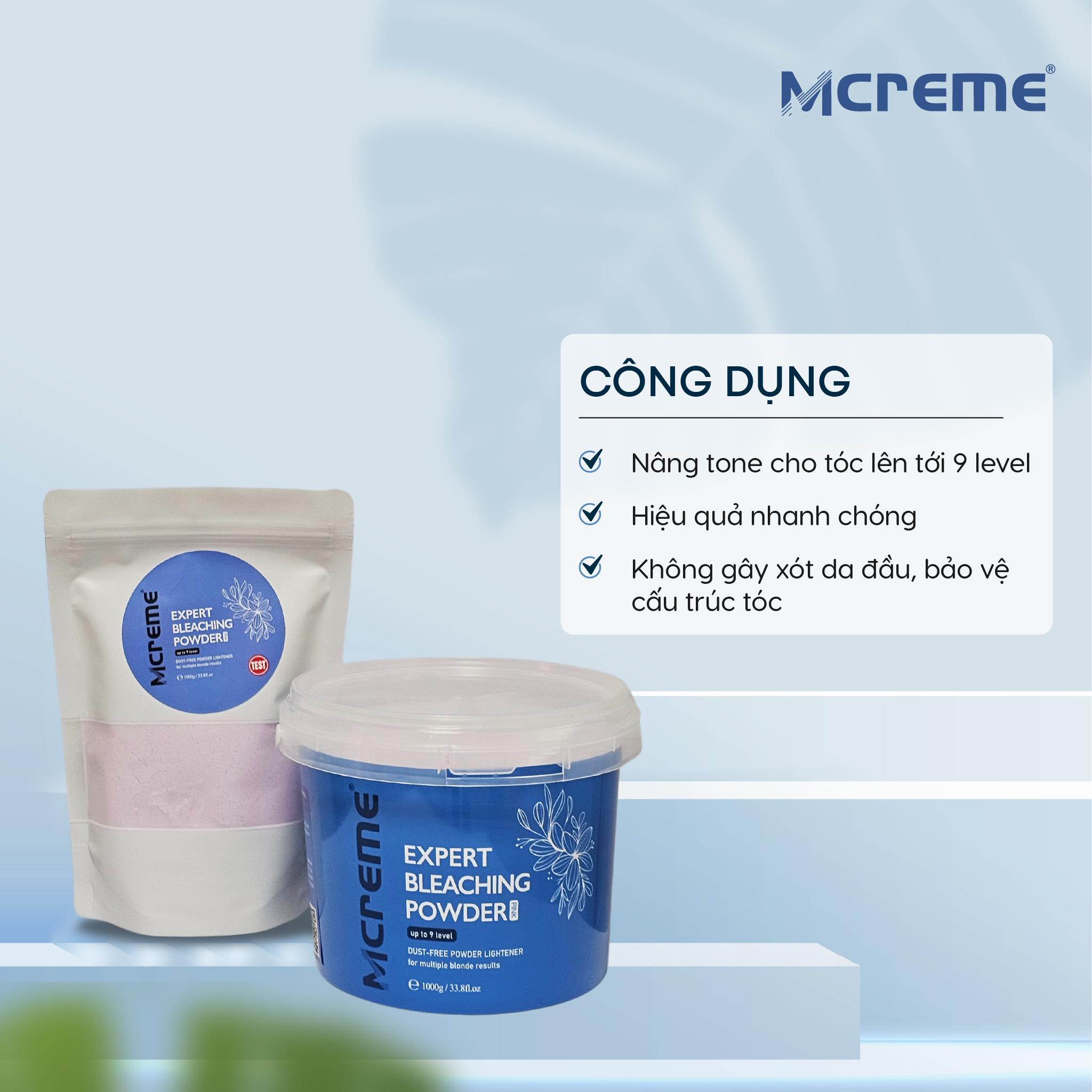 - Công dụng: Công nghệ bột tẩy mới nhất đến từ Mcreme Expert Bleaching Power giúp bạn nâng level mái tóc lên đến 9 cấp độ mà vẫn đảm bảo bảo vệ các liên kết trong cấu trúc tóc, đảm bảo tẩy tóc hiệu quả